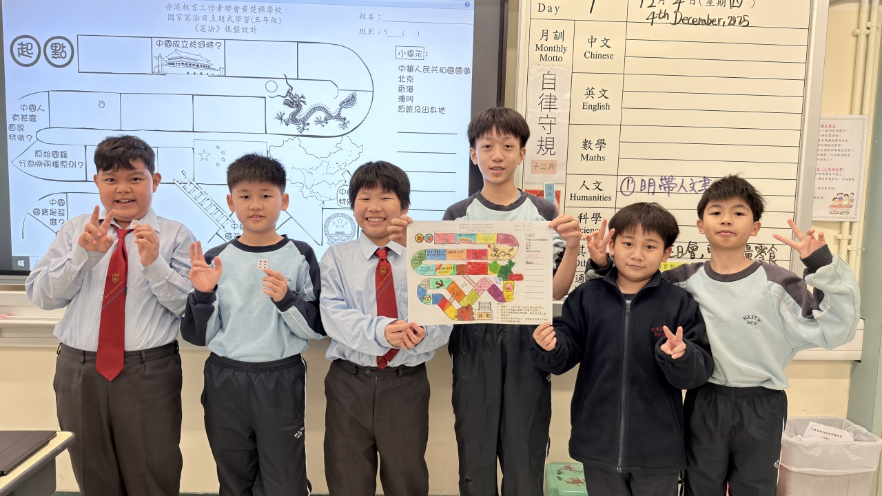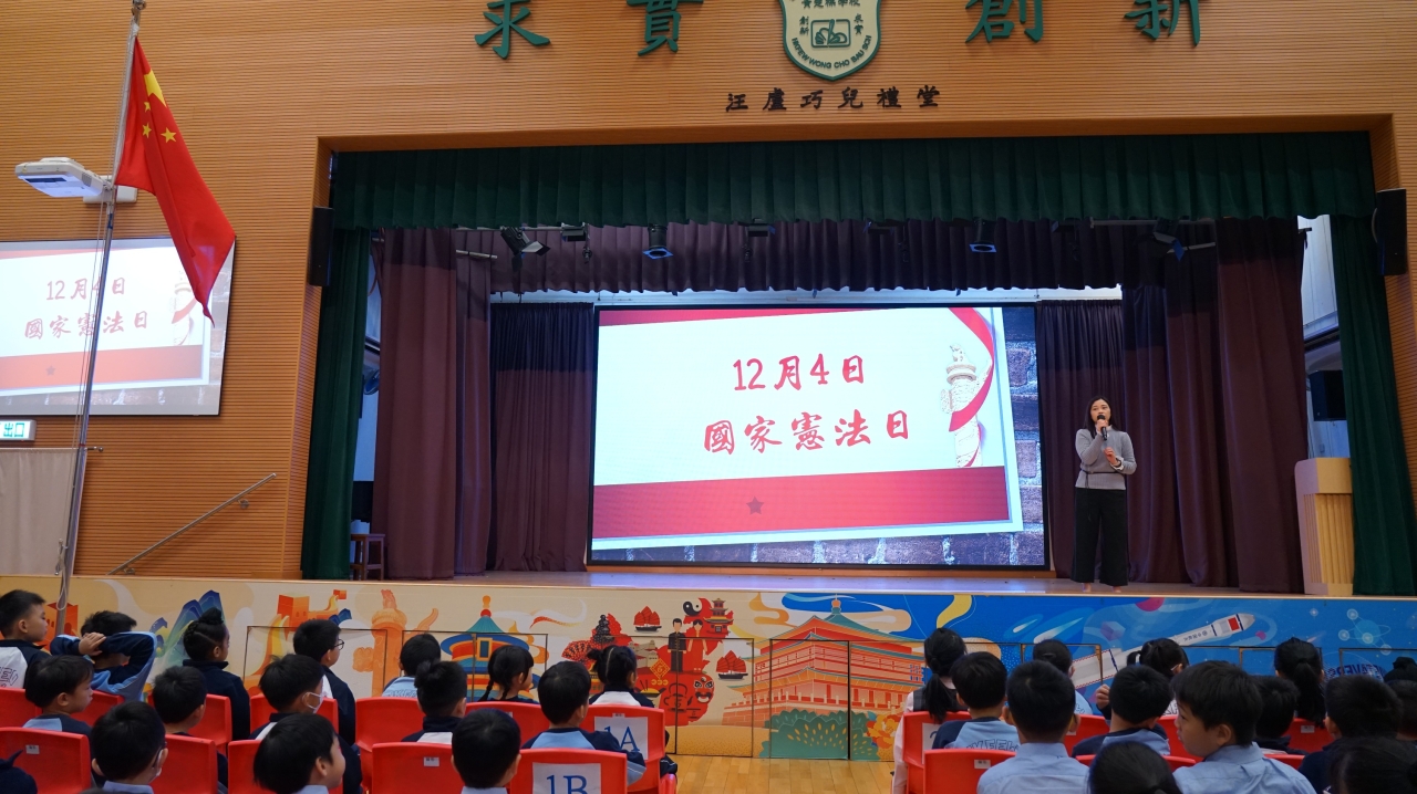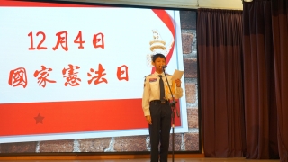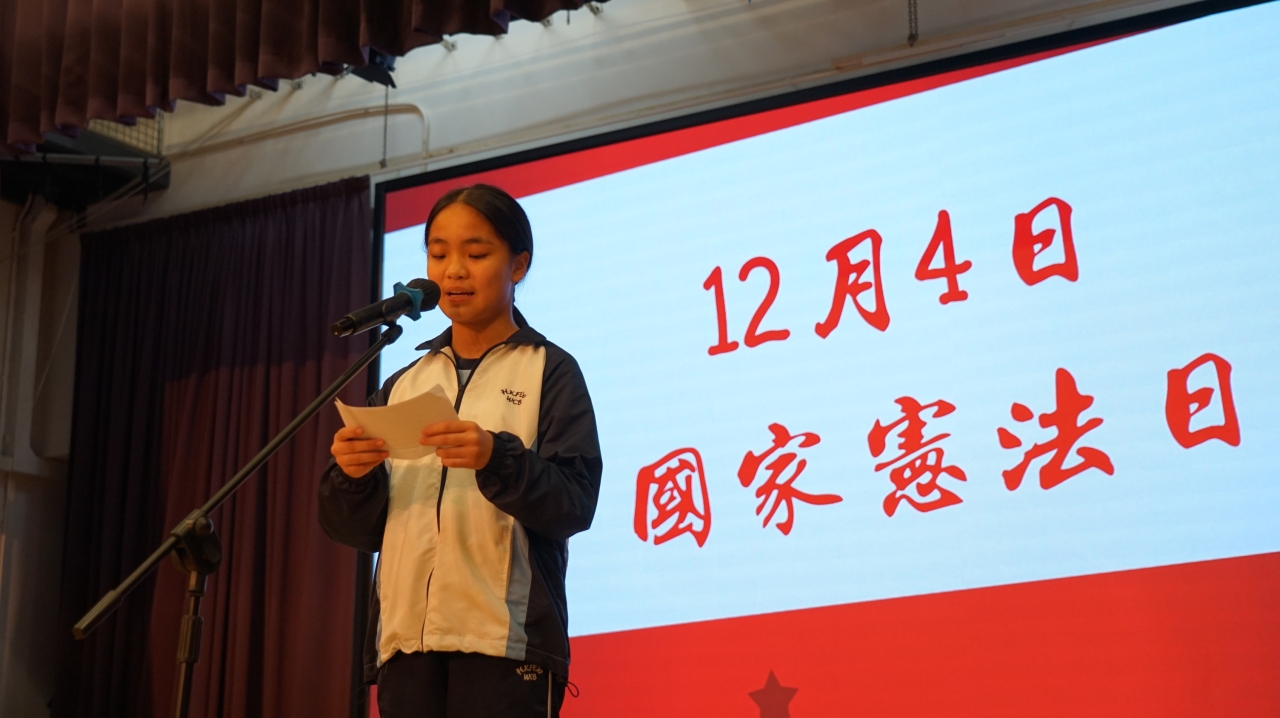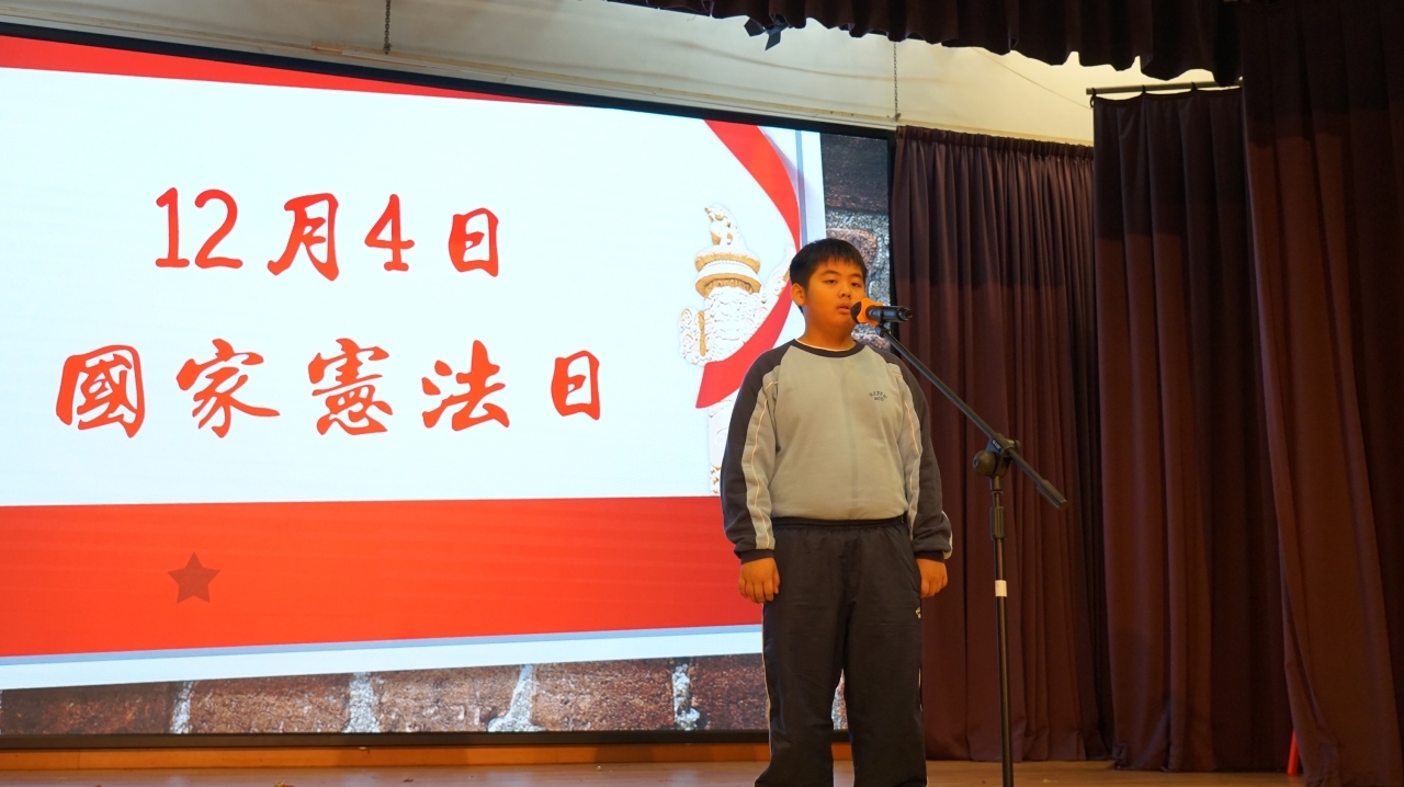12月4日是「國家憲法日」。為了增進學生對《憲法》、《基本法》和國家安全的知識,本校於當天安排了「國家憲法日」校本課堂學習及延伸活動。本年學生亦參與由教育局特別舉辦的「國家安全短講比賽」,並同時於「國家憲法日」當天向全體學生進行短講分享,從時事、日常生活作例子,以及個人理解及體會等方面切入,思考及連結國家安全與自身的關係,表達對「總體國家安全觀」的理解,以培養國學生的國民身份認同、尊重法治、守法及共同維護國家安全的意識。