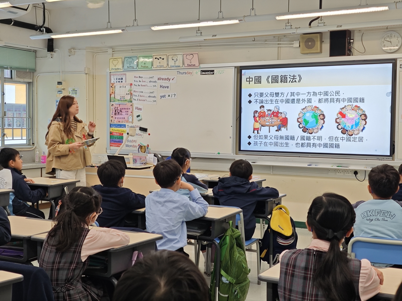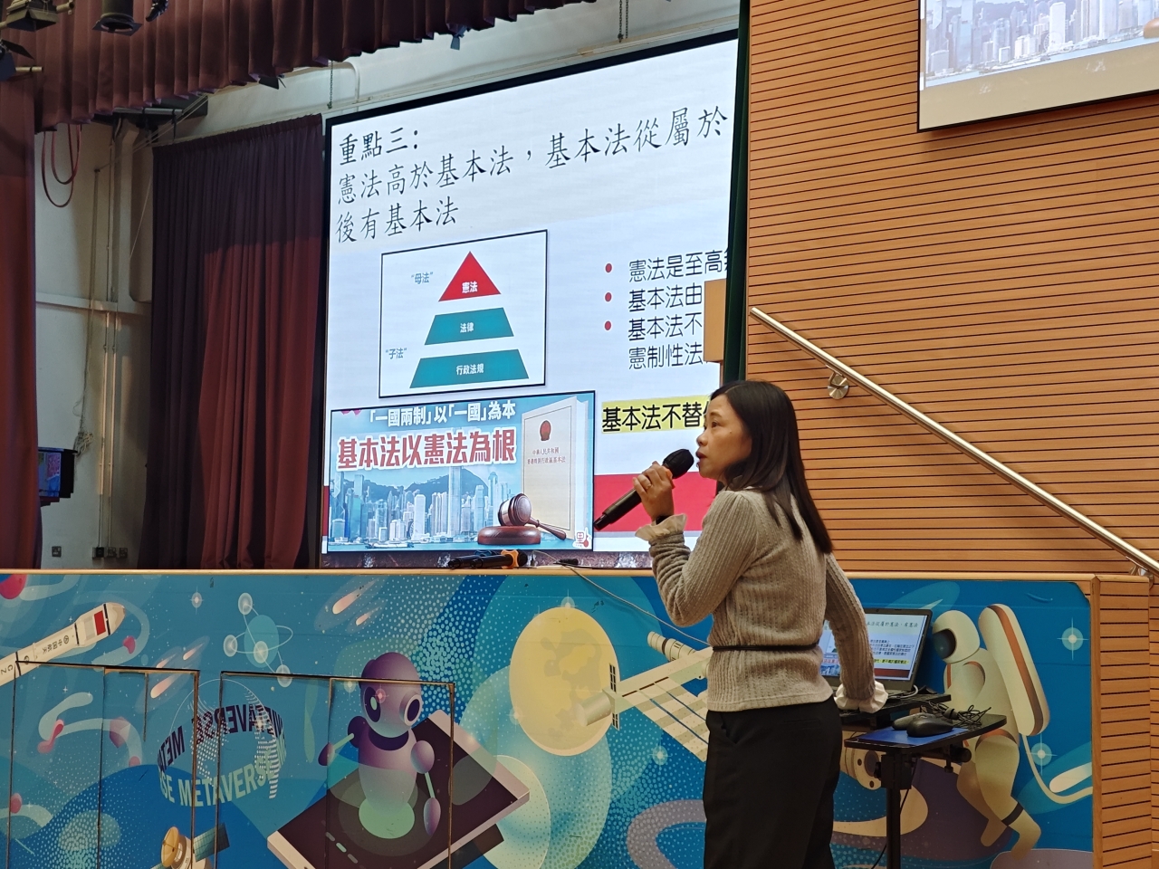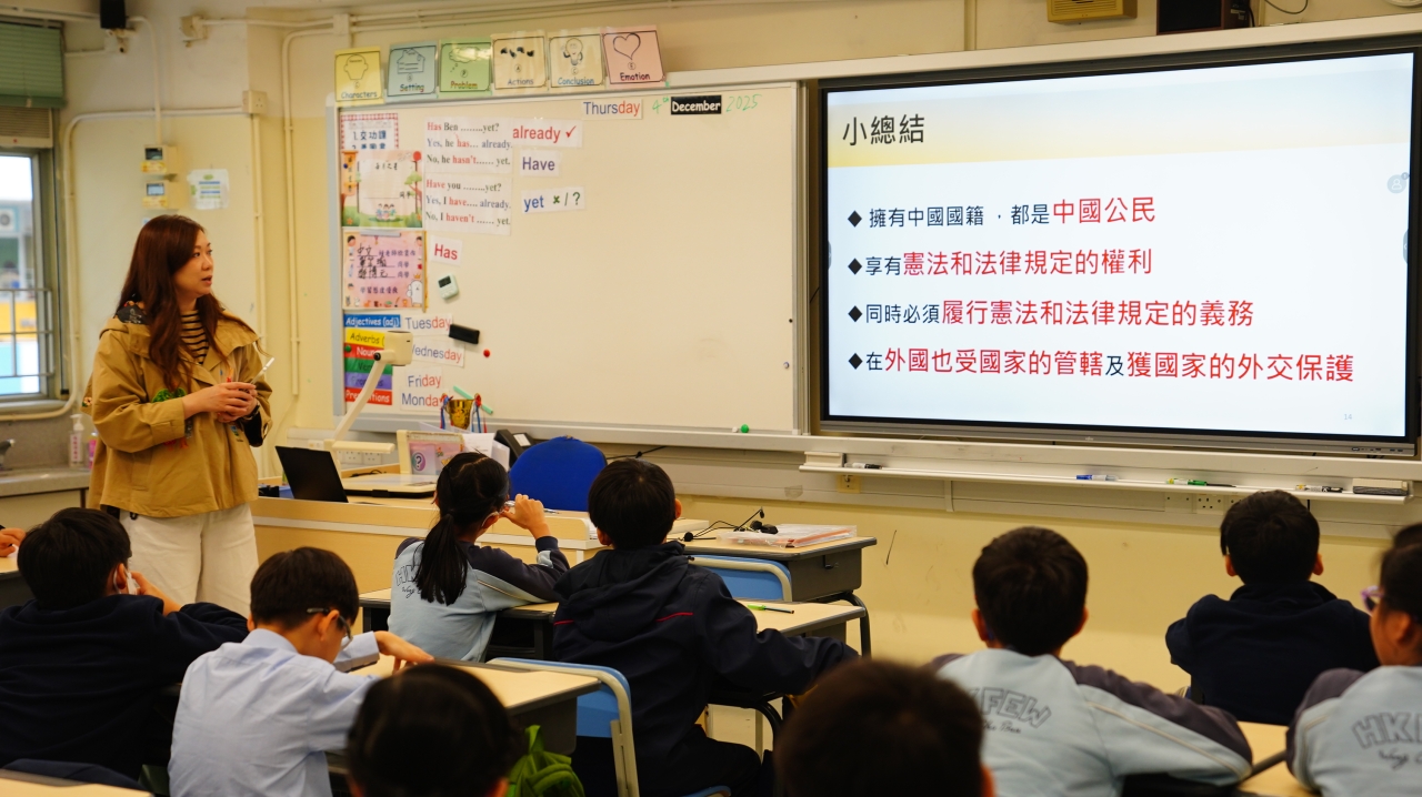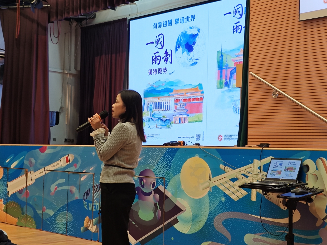 12月4日是「國家憲法日」。為了增進學生對《憲法》、《基本法》和國家安全的知識,本校於當天安排了「國家憲法日」校本課堂學習及延伸活動。本年學生亦參與由教育局特別舉辦的「國家安全短講比賽」,並同時於「國家憲法日」當天向全體學生進行短講分享,從時事、日常生活作例子,以及個人理解及體會等方面切入,思考及連結國家安全與自身的關係,表達對「總體國家安全觀」的理解,以培養國學生的國民身份認同、尊重法治、守法及共同維護國家安全的意識。
