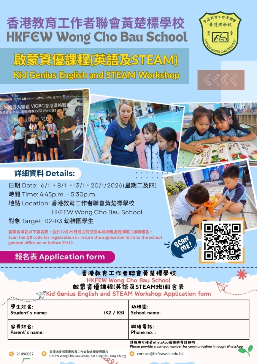 2025-2026年度第二期的啟蒙資優課即將開始,本年度開設了「英文ABC」和「STEAM小達人」課程,此課程既能提升幼童學習興趣,亦能激發多元智能,大家快來報名吧!